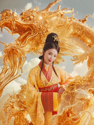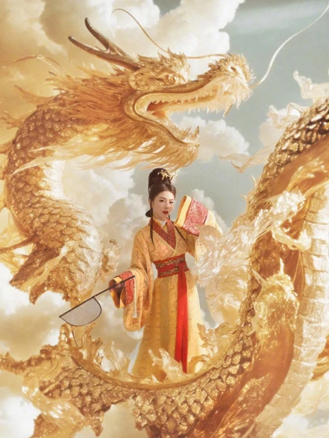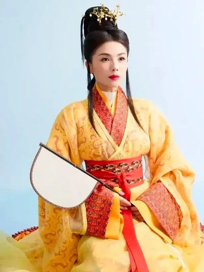 Liu Tao's outfit consists of a Zhiju robe and a Gui Yi, with yellow as the main color, representing a solemn and grand emotional meaning. The pattern combines the patterns of the Chinese flowering crabapple and clouds, with a cape made of swallowtail gauze.
