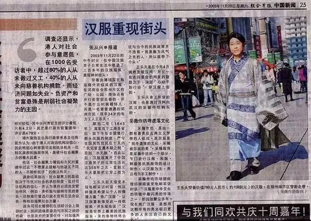On November 22nd of the same year, a power plant worker named Wang Letian, with the assistance of the first Hanfu store in China, Caiwei Workshop, replicated a Hanfu style from the TV drama "The Prince of Han Dynasty" and walked the streets of Zhengzhou. This event, reported by Singapore's Lianhe Zaobao, immediately attracted widespread attention from both domestic and international media, marking the first significant public event that propelled the Hanfu revival movement.