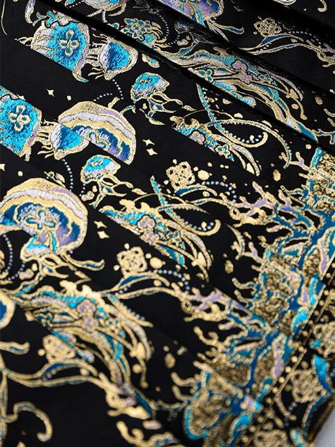 Apart from the overall effect, different craftsmanship techniques on the skirt can subtly change the garment's character. One technique is embroidery. Embroidered patterns on the skirt surface are common. Mamian skirts in Qing Dynasty style often emphasize dense and intricate embroidery on the skirt gate. Another technique is imitation Zhuanghua. "Zhuanghua" itself is one of the most complex weaving techniques in Nanjing Yunjin brocade. Imitation Zhuanghua Mamian skirts have rich patterns and varied colors. A third technique is imitation Zijin. As the name suggests, "Zijin" involves weaving patterns with golden threads. Compared to imitation Zhuanghua, the colors in imitation Zijin are relatively simple. Depending on the type of gold thread, there are flat gold, round gold, and wrapped gold.