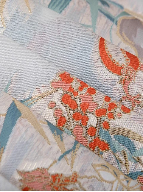 Flat gold is made by cutting gold foil glued onto paper into strips about 0.5 mm wide, and round gold involves wrapping flat gold thread around cotton or silk threads. Wrapped gold, also known as filled gold or soft gold, is mainly made by winding nylon or smooth polyester threads around metal sheets. Flat gold is the most common and creates many reflective surfaces on the fabric, giving the pattern a lustrous appearance. However, flat gold thread can easily flip, which should be noted as a normal phenomenon, not a defect. Compared to flat gold, round gold is less likely to flip and has a higher gloss, presenting a misty grainy texture. Wrapped gold has longer color retention and better gloss.
