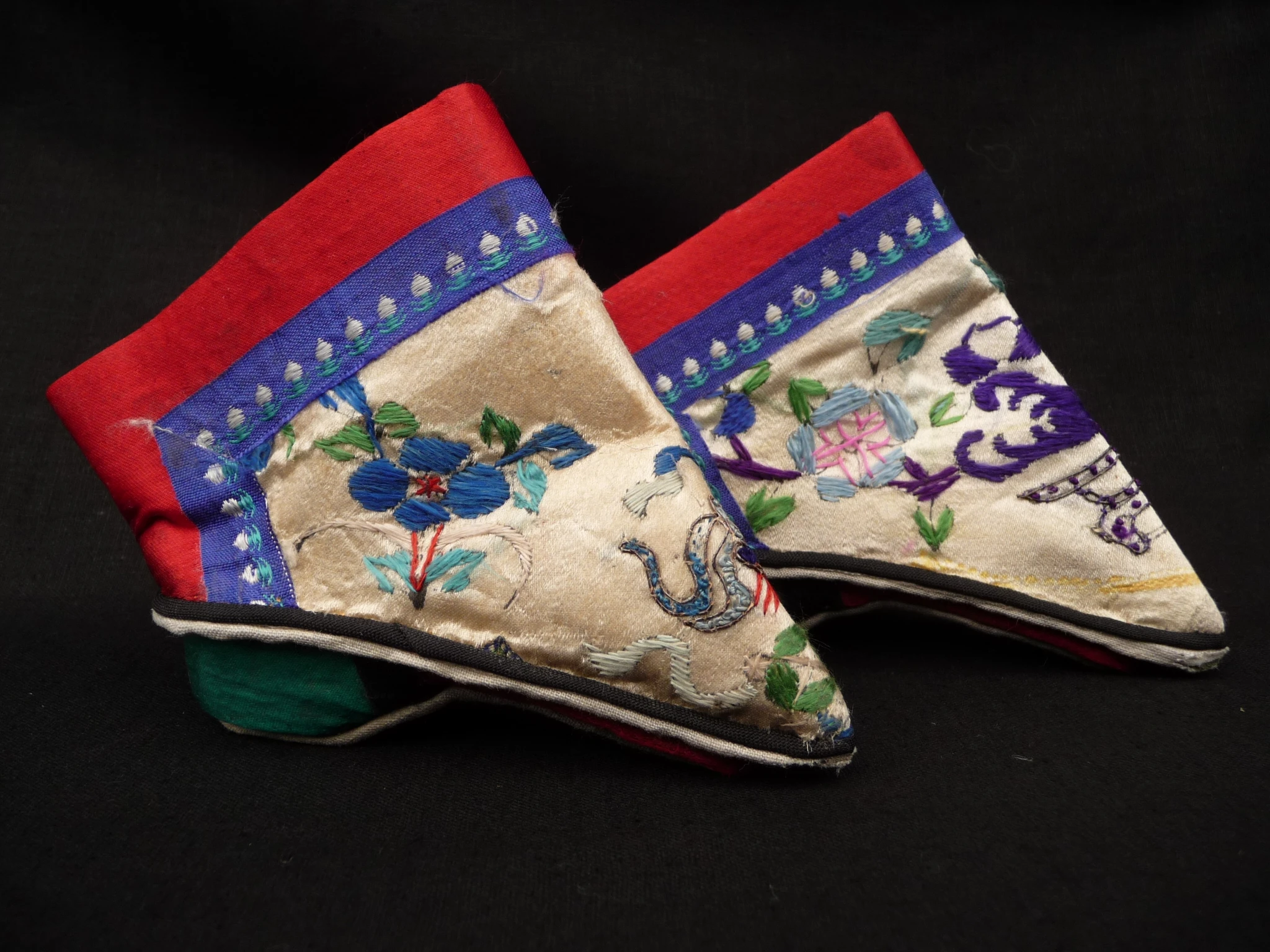 The process could cause paralysis, gangrene, ulceration, or death, though death was rare. Binding the feet continued for the rest of the girl’s life. Decorative shoes and leggings were worn over the bandages and could differ with the time of day and occasion.