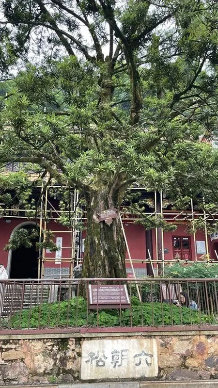 In the shadow of the majestic Yuelu Mountain (岳麓山), nestled near the iconic Lushan Temple (麓山寺) in Changsha, stands a remarkable living relic—an ancient Luohan pine (罗汉松) tree, famously known as the "Six Dynasties Pine." This grand tree is not only a symbol of natural beauty but also a testament to history, believed to have been planted during the Six Dynasties period (circa 4th century). With an estimated age of over 1,740 years, the Six Dynasties Pine is the oldest tree within Changsha’s urban area, standing as a timeless guardian of the temple grounds.