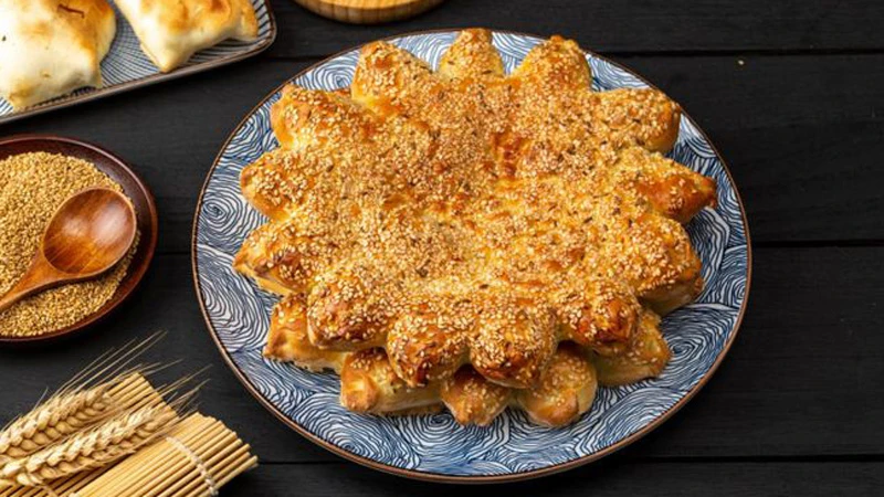 Naan in Xinjiang is not just one type—it's a whole family of breads, each unique in shape, size, and flavor. It is said that there are at least 300 different kinds of naan in Xinjiang, and they range from simple, everyday varieties to elaborate creations meant for special occasions. One of the most common varieties is "Ake naan," which is typically medium-sized with a round shape and a distinctive pattern pressed into the dough before baking. It is often coated with chopped onions before baking, resulting in a golden, aromatic crust. The sesame naan, which is sprinkled with sesame seeds, has a rich, nutty flavor and is equally popular.