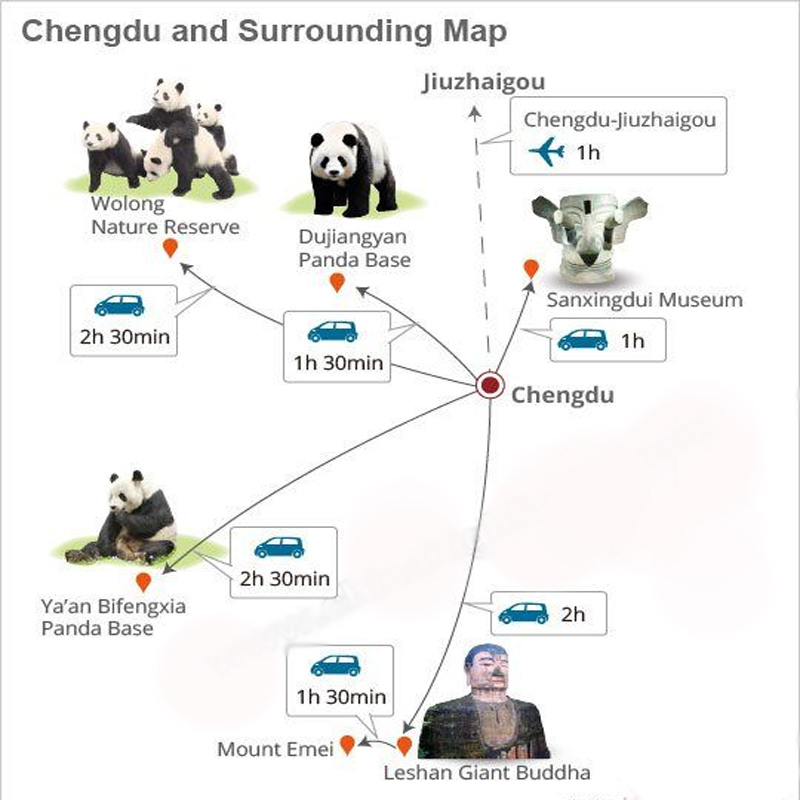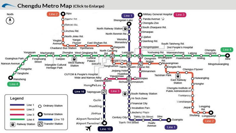 Metro: 13 lines covering major attractions (e.g., Line 3 to Giant Panda Base). Download MetroMan for real-time maps.