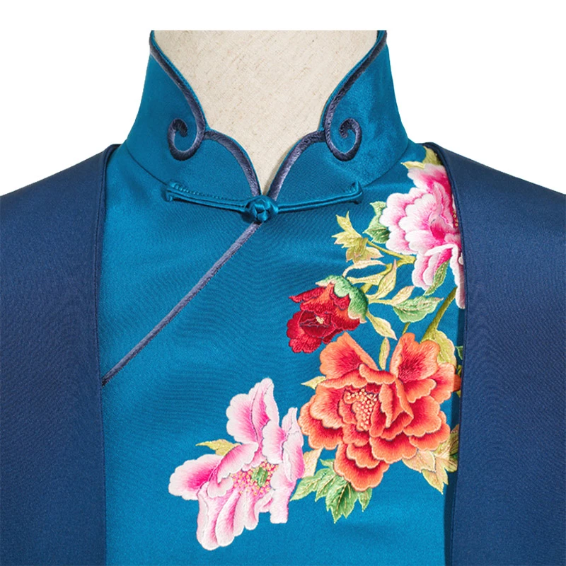 Spouses' Attire: Celadon-hued capes over embroidered qipao dresses