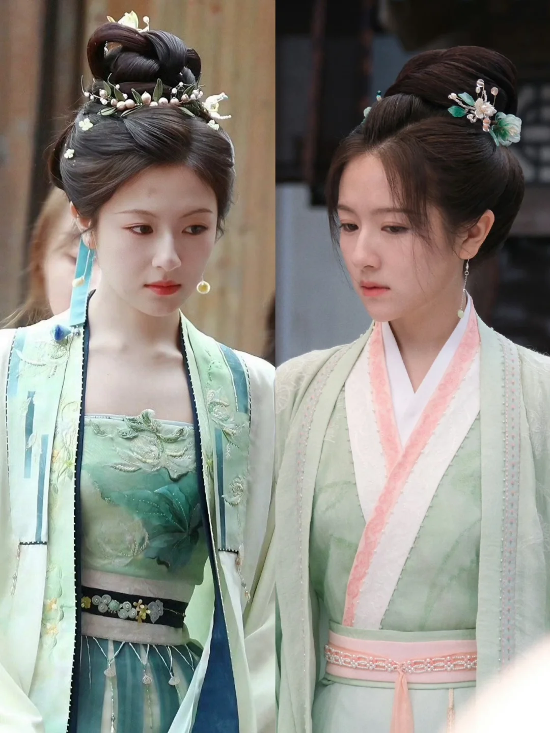 Why do Li Landi's makeup and hairstyles seem so simple? Especially when compared with her image in another drama, although both are in green clothes with coiled hair, there's an obvious difference in visual finesse. In another drama, after changing the eyebrow shape and adding heavy shadows, she looked completely different from her original self. While it was delicate, not every face shape and temperament needs to match complex classical makeup and hairstyles.