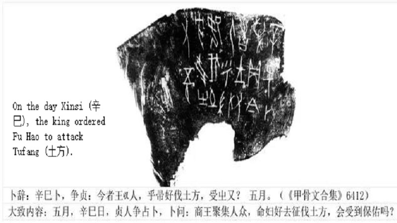 Oracle bone inscriptions offer a detailed record of Shang governance. For instance, during the reign of Wu Ding (武丁), the female general Fu Hao (妇好) led military campaigns against the Qiangfang (羌族), as recorded in: "On the day Xinsi (辛巳), the king ordered Fu Hao to attack Tufang (土方)." This confirms that elite women in the Shang Dynasty could wield military power.