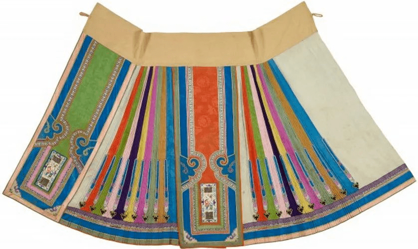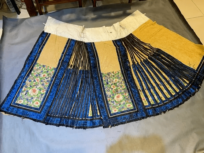 The Ming era (1368–1644) elevated simplicity to an art form. Horse-face skirts from this period favored clean lines and subtle symbolism, reflecting the dynasty’s revival of Han Chinese traditions after Mongol rule. Dominated by solid hues like indigo, russet, and ivory, these skirts derived beauty from precision tailoring rather than overt decoration. The most elaborate Ming examples featured narrow lan (襕)—decorative bands at knee level—embroidered with understated geometric patterns or small floral motifs. A mid-16th century skirt from a Nanjing tomb exemplifies this ethos: its unbleached hemp fabric bears a single band of silver-thread cloud designs, a nod to scholarly ideals of humility and harmony with nature.