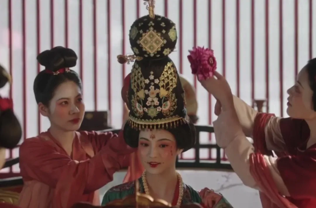 During the early Tang Dynasty, crowns from the empress down to fifth-rank noble women featured Huashu/Huadian and Bobin. The number of these decorations varied by rank: twelve for the empress, nine for first-rank noblewomen, decreasing sequentially to five for fifth-rank noblewomen. Female officials during Wu Zhou’s reign wore Bobin as shown in the upper-left image. Their attire, compared to noblewomen’s formal wear, leaned more toward everyday ceremonial dress. It’s also important to note that noble titles were conferred based on merit—either through the husband’s or descendants’ achievements or the woman’s personal virtues or outstanding deeds, as decreed by the emperor. One stipulation was that only wives, specifically primary wives, could receive such titles, entitling them to ceremonial attire. In the drama, He Weifang, as Jiang Changyang’s concubine, never received a title or rank, making her wearing this crown somewhat awkward. This might be a creative liberty for the plot.