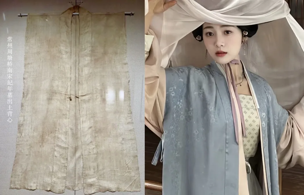 Archaeological findings from the Southern Song Dynasty, such as those from the Huang Sheng tomb, reveal a variety of sleeveless garments, including Beixin, long and short shirts, two-piece skirts, and more. These garments were lightweight and breathable, making them ideal for summer wear. For instance, one dark peony-patterned Beixin measured 70 cm in length, 44 cm in waist width, and weighed only 16.7 grams—lighter than half a liang (两), a traditional Chinese unit of weight.