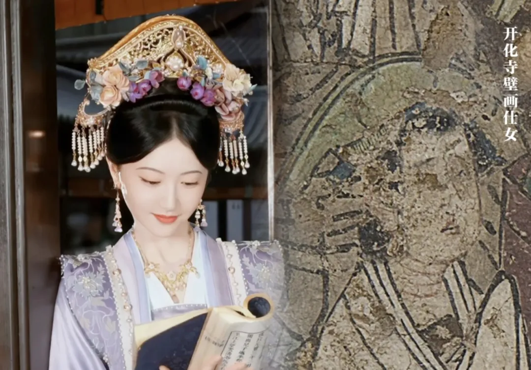 Additionally, the drama added 'bobin' (side tassels) to Jing Tian's headdress. Bobin is a formal accessory for noblewomen and deities, usually paired with phoenix or pheasant crowns. Combining an informal drooping crown with formal bobin creates a mismatched look, which is a common issue in costume dramas. Bobin dates back to the Northern and Southern Dynasties.
