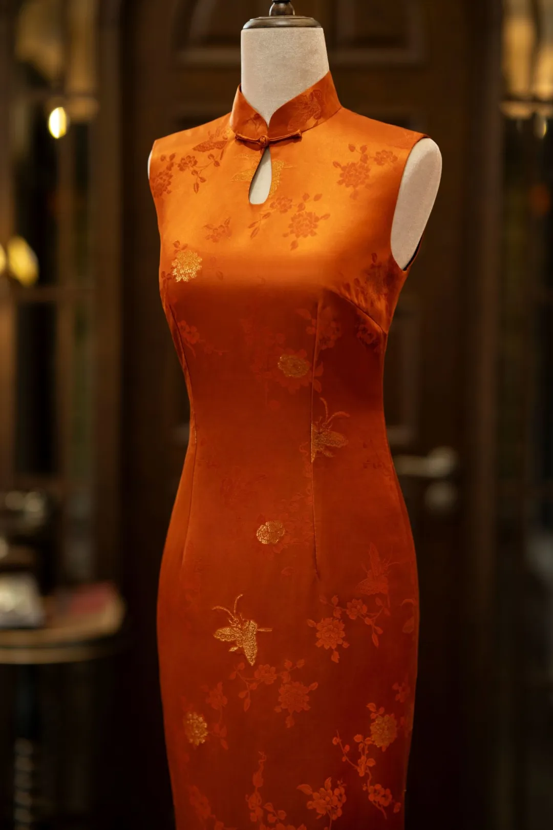 The main palette is 80% canna orange, 15% crab - shell red, and 5% gold. Bright as the sun, the canna orange hue highlights the wearer’s radiance. The short sleeves and subtle curves enhance the allure, while golden butterflies and peonies on the silk jacquard evoke Tang Dynasty opulence. This is no ordinary cheongsam but an Eastern fable worn on the body.
