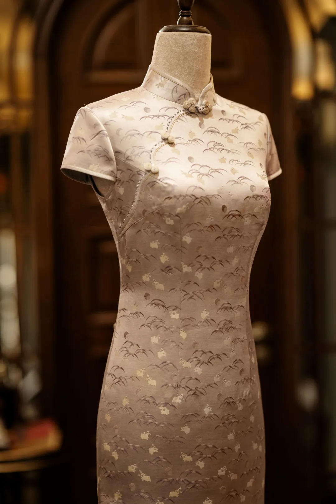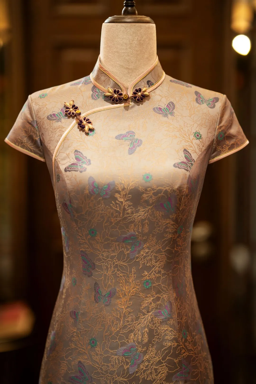 The main palette is 45% light silver - gray, 45% pepper - room color, 5% purple, and 5% stone green. This cheongsam recalls the poem 'Longing for a Lover’s Favor'. The silver - gray, tinged with warm brown, resembles crumpled Jiangnan (江南) twilight, with purple butterflies fluttering. The matte texture, accented by stone green and purple, exudes a gentle elegance.