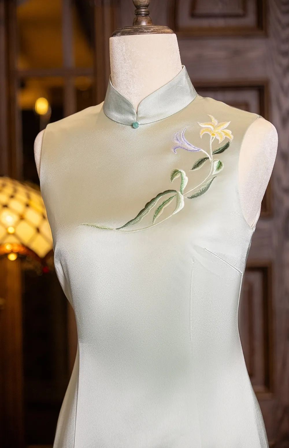 Spring wouldn't be complete without a cheongsam matching the shimmering spring waters and verdant willows. This one is in the traditional Chinese 'egg - shell green,' similar to ancient jade tones. The smooth, glossy acetate fabric enhances its refined and noble aura. The sleeveless design emphasizes a tall, sleek figure, and two red lotus flowers embroidered like water nymphs in a lake evoke a serene, poetic scene.