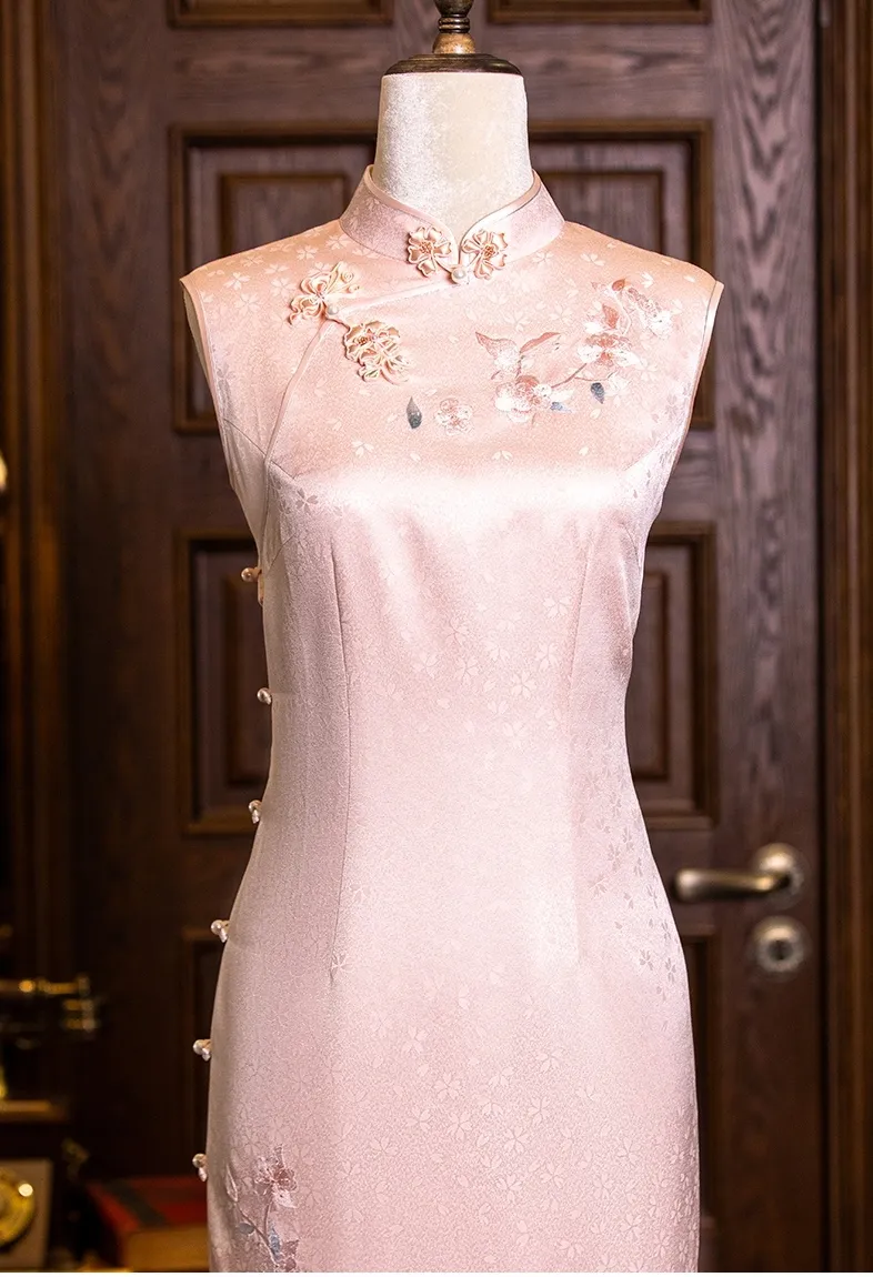 Romantic and delicate, this pink cheongsam features petite floral patterns on modified silk, evoking April’s gentle blossoms. Handmade silk - thread buttons with pearl accents and butterfly embroidery add a fairy - tale charm. The vertical design and sleeveless cut flatter the figure, offering a modern, slender look.