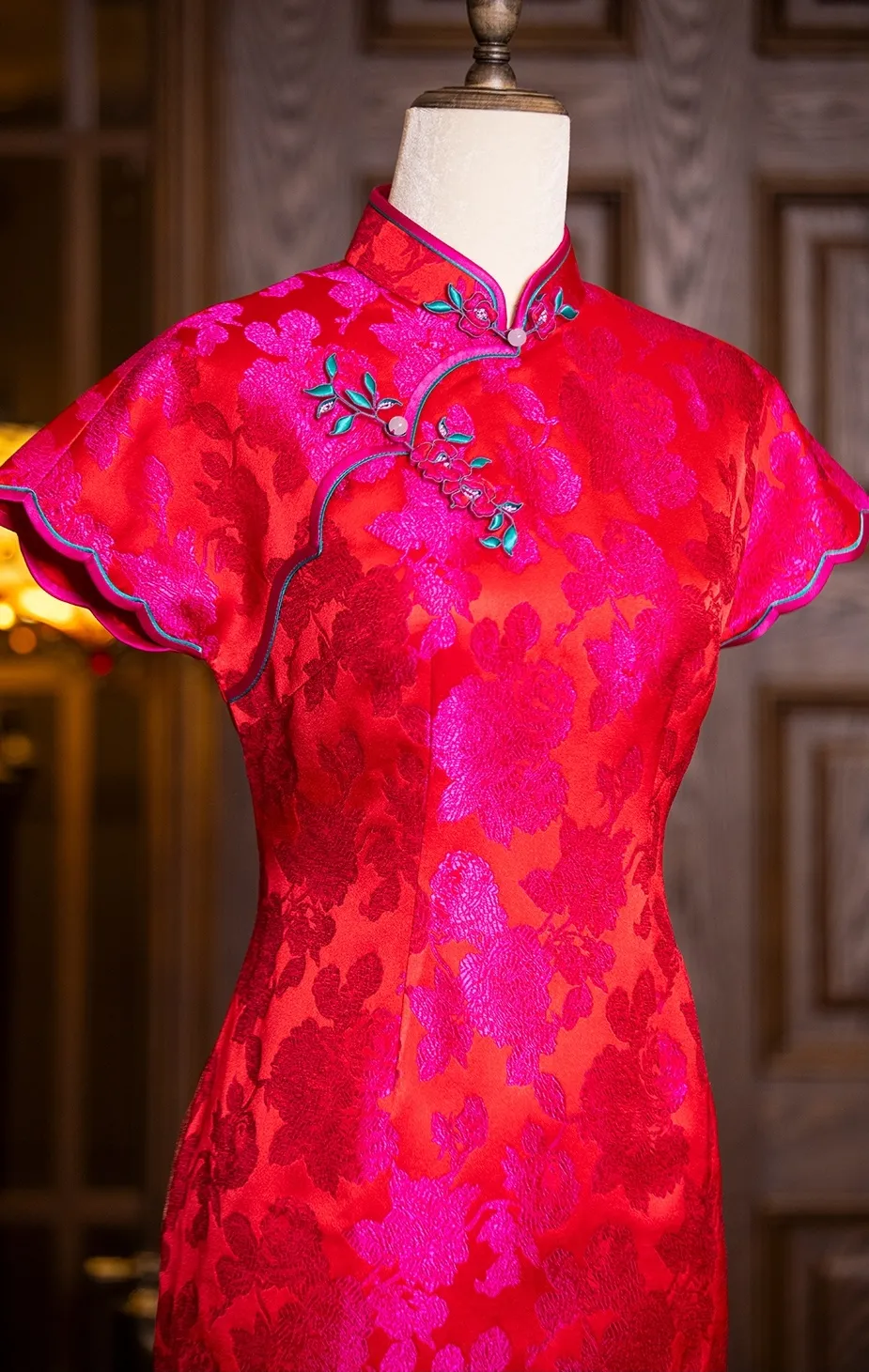 Dazzling and vibrant, this red cheongsam in silk brocade embodies luxury. The bright'vermilion red' contrasts with peony pink, accented by touches of 'fatsui blue.' The wavy sleeves and lapels, along with intricate handmade buttons, make it strikingly beautiful and passionately stylish. Our team, your exclusive custom butler, looks forward to surprising you.