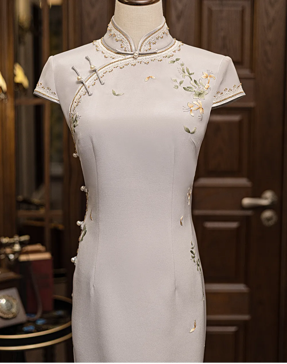 Inspired by Li Yu’s poem, this cheongsam in traditional 'limestone gray' offers a sophisticated, understated beauty. The embroidery of drifting flowers near lace trims, along with large round lapels, creates a garden - like scene of blooming flowers and quiet fragrance. The stand - up collar and small cap sleeves add to its dignified charm.