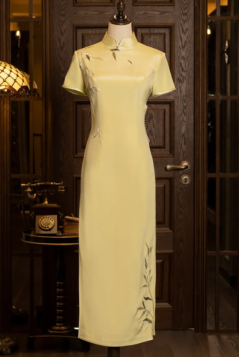 A well - chosen yellow cheongsam can brighten the complexion and radiate youthful energy. The traditional 'oriole yellow' of this piece embodies the warmth of spring. The semi - sleeve, straight - cut design is both dignified and subtly sexy, with delicate lace waist details and pearl trims. Embroidered bamboo leaves add dynamic beauty to the slender skirt.