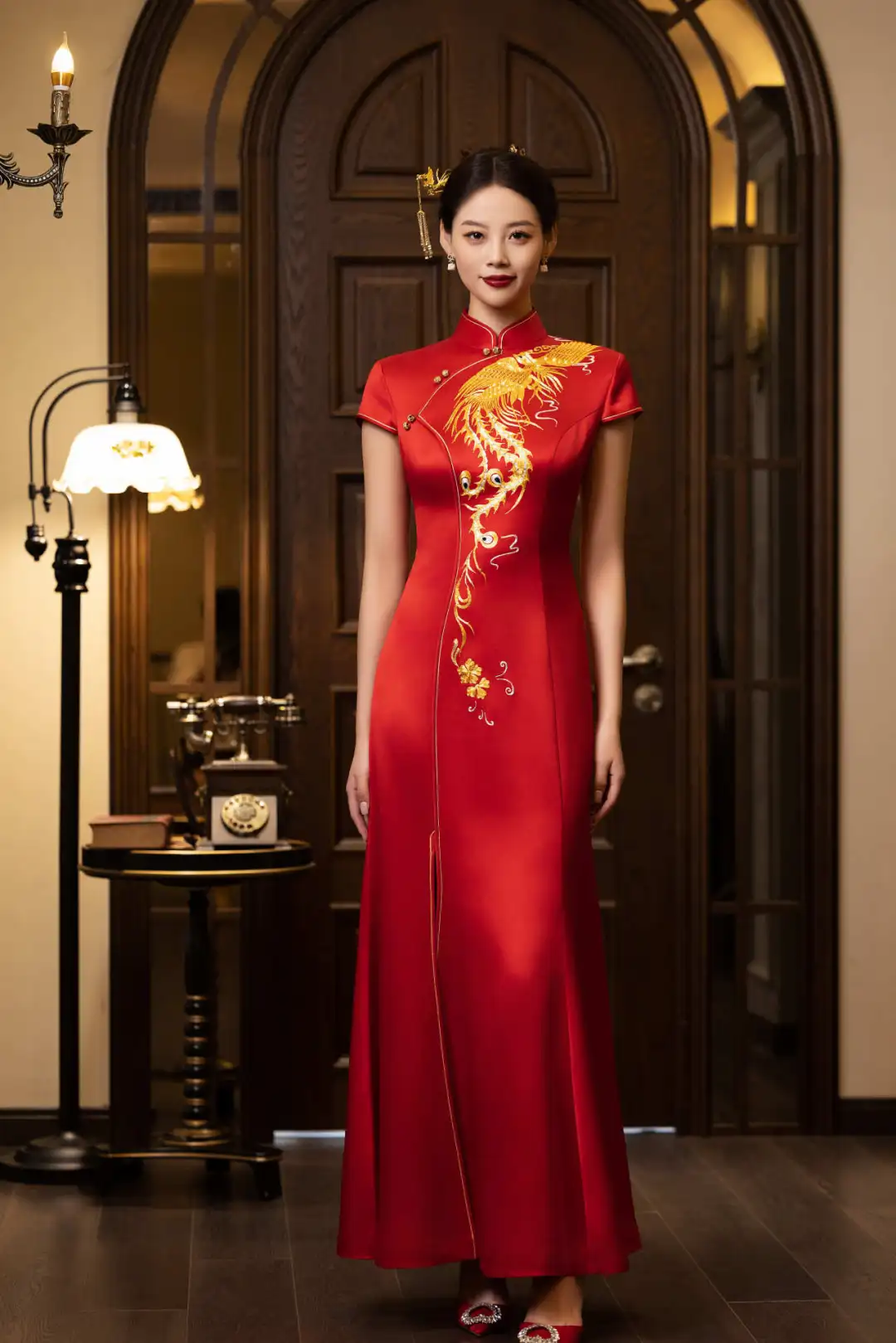 The fishtail skirt cheongsam is not as common as the previous two, but its unique shape and elegant, romantic charm make it a classic and gorgeous symbol. As the name suggests, the fishtail skirt is shaped like a fish tail. It's fitted from the waist to the knees and then flares out in a fan shape, showing a very beautiful and sexy curve.