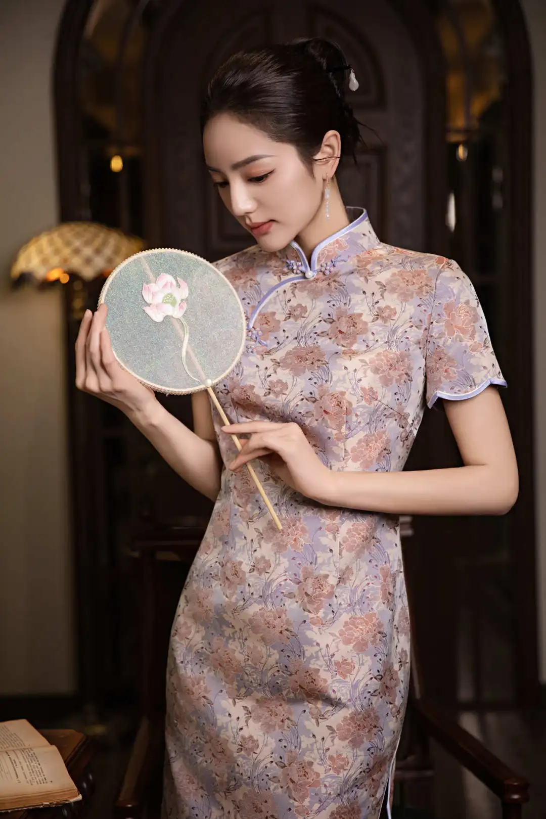 If fabric is the essence of a Qipao, then a Qipao made of Song Jin (宋锦) is a living embodiment of rich historical and cultural heritage. It dates back to the Song Dynasty, telling the story of that era's splendor and the remarkable weaving craftsmanship. A Song Jin Qipao is an excellent choice for summer. With its firm yet soft texture, elegant patterns, and classical allure, the wearer exudes artistic charm and noble grace. Take this Song Jin Qipao as an example. Its unique, classical floral print is eye - catching. The straight - cut silhouette with wavy edges adds a touch of playfulness, while the bold peony motifs in soft camel and light purple create a poetic harmony.