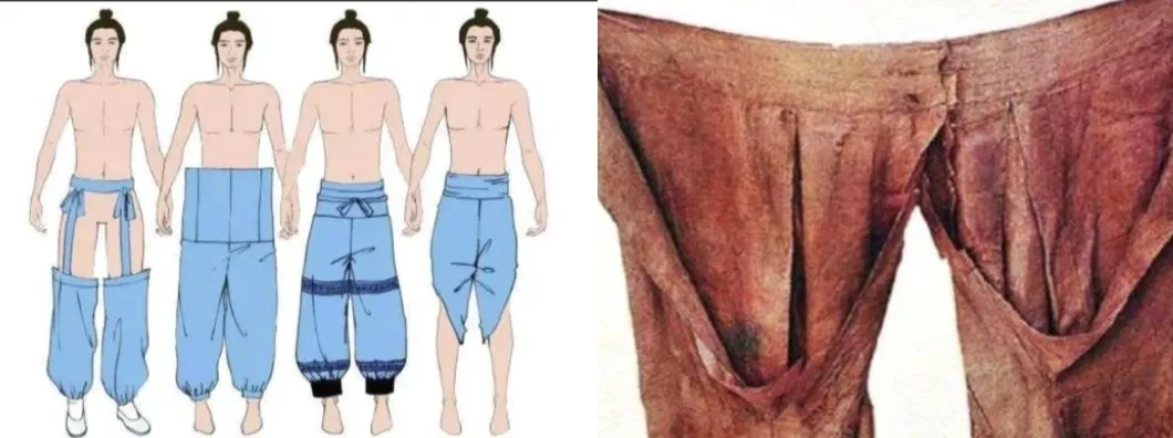 Let's go even earlier to trace the origin of these cinched - leg pants. We can see from the shin - covering clothes popular in the Qin and Han dynasties and the pants unearthed from the Mashan Chu Tomb that there were also cinched designs at the cuffs. The cinching might not be at the cuffs but at the knees. For example, in the ku - zhe outfits popular during the Wei, Jin, and Southern and Northern Dynasties, people usually wore flared pants on the lower body. Some would tie a long belt at the knee bend, which made walking more convenient. This was also called 'tied pants'. These pants usually appeared in the military and were later adopted in daily life. For a while, it was fashionable for everyone to wear ku - zhe outfits.