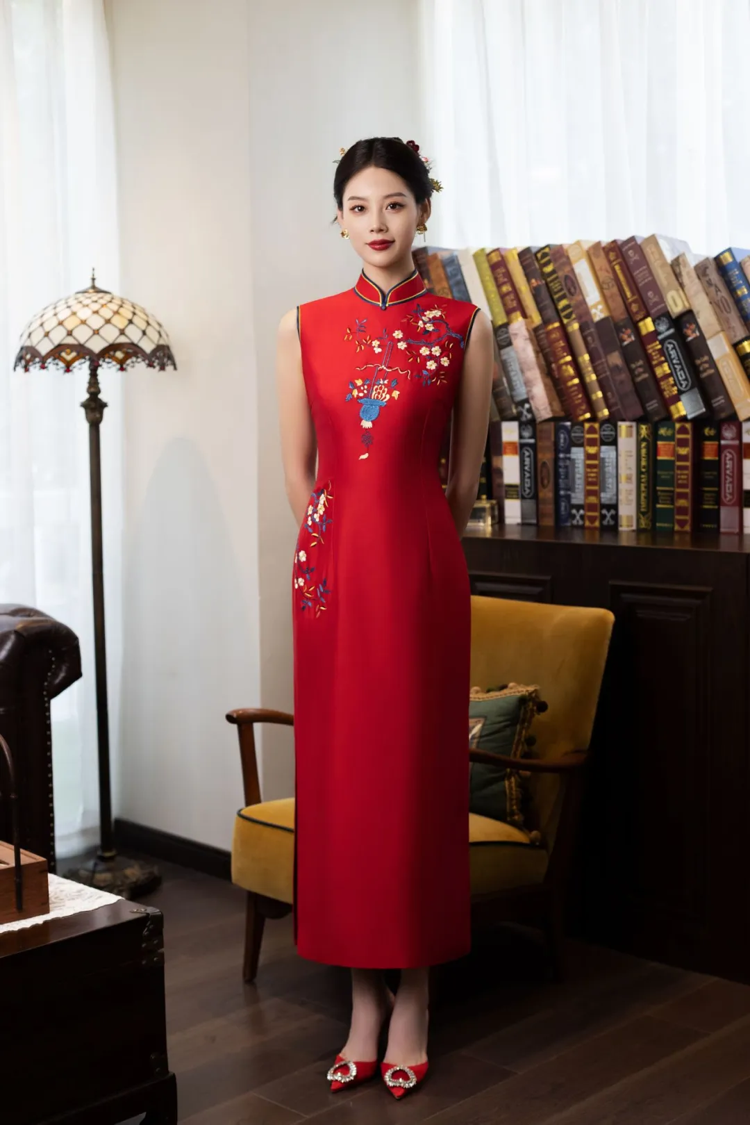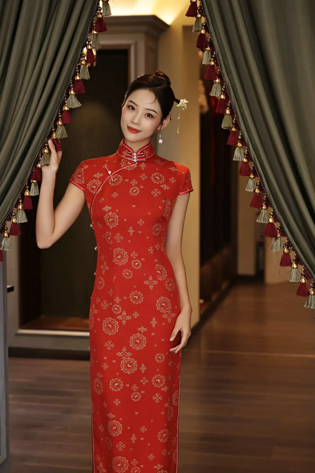The next two cheongsams are definitely the stars and focal points on any occasion and festival. The large areas of glittering gold and silver embroidery, inspired by phoenixes and peonies, are as magnificent as a firework display. The red and gold colors blend, making them unforgettable at first sight. The colors and styles of these two cheongsams are also worthy of special praise. The thick ruby color is like a splash of wealth, echoing the fishtail skirt with charm. The graceful charm combines with the hidden curve beauty. Wearing them on the grand occasion of the Lantern Festival is just like the beautiful poem: "Phoenixes face each other in gold - embroidered patterns, and peonies are bathed in a light rain overnight."