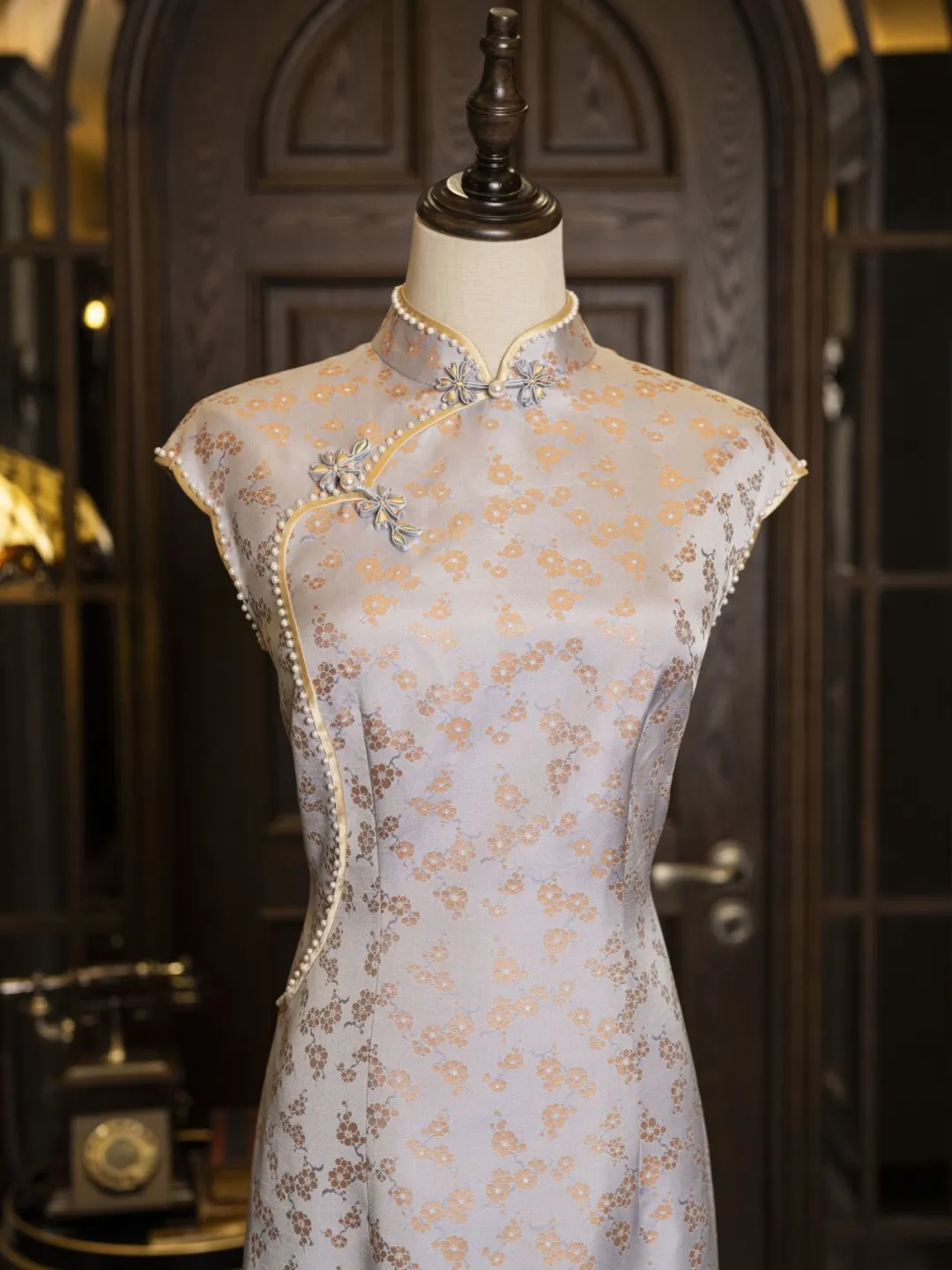 If the material is the foundation of a cheongsam, and the color is its flesh and blood, then the pattern is its soul. It is the origin that supports the cheongsam to stand up. It is also the key for a cheongsam to look good and stylish. Take the cheongsam our team recommends next. It features a wavy round collar, inlaid with small round pearls, which can just modify the beautiful curves of women. Paired with dropped - shoulder sleeves that end lazily, the whole is both grand and unique, both reserved and stylish. Of course, the material of this cheongsam is also a rare good one, made of precious Song brocade. As the crown of brocades, each pattern of Song brocade is unique. Just like the small broken - flower pattern on this cheongsam, it is delicate and beautiful, full of romantic and interesting charm.
