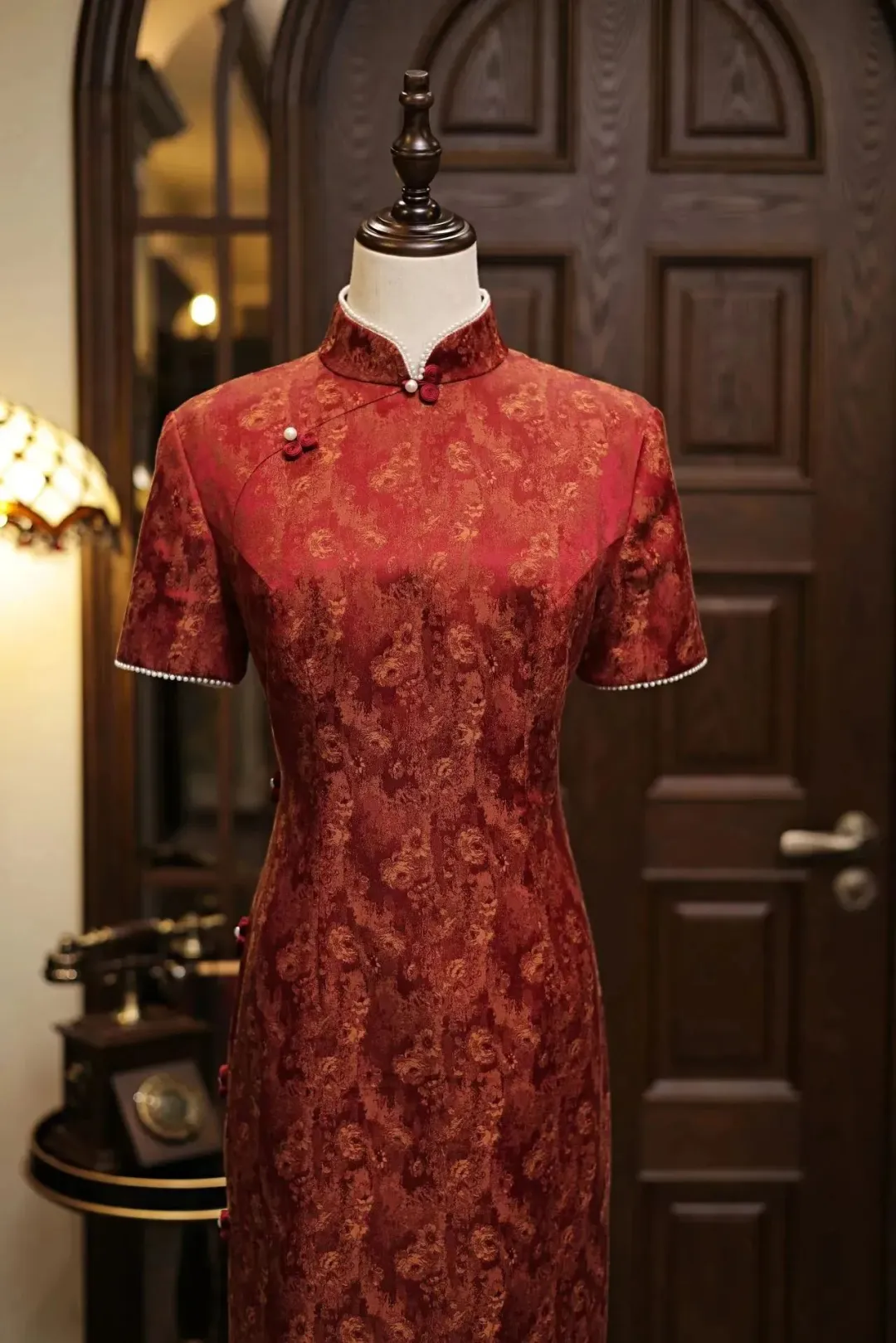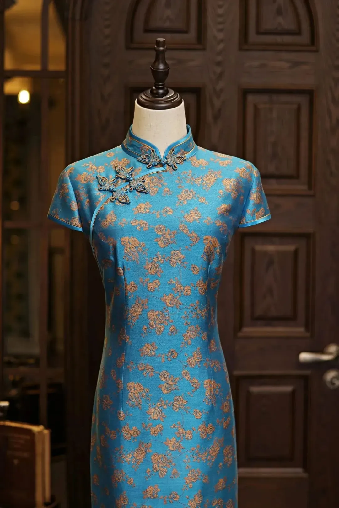 Chambray Blue: It's a very light blue with a touch of white, making it clean and transparent, like a cloudless sky. A cheongsam in this color has a charming effect. The blue is used in jacquard to create a delicate effect, matching the delicate flower - shaped buttons. The high - waisted and straight - skirt style combines the curve of the body and the romance of the sleeves.