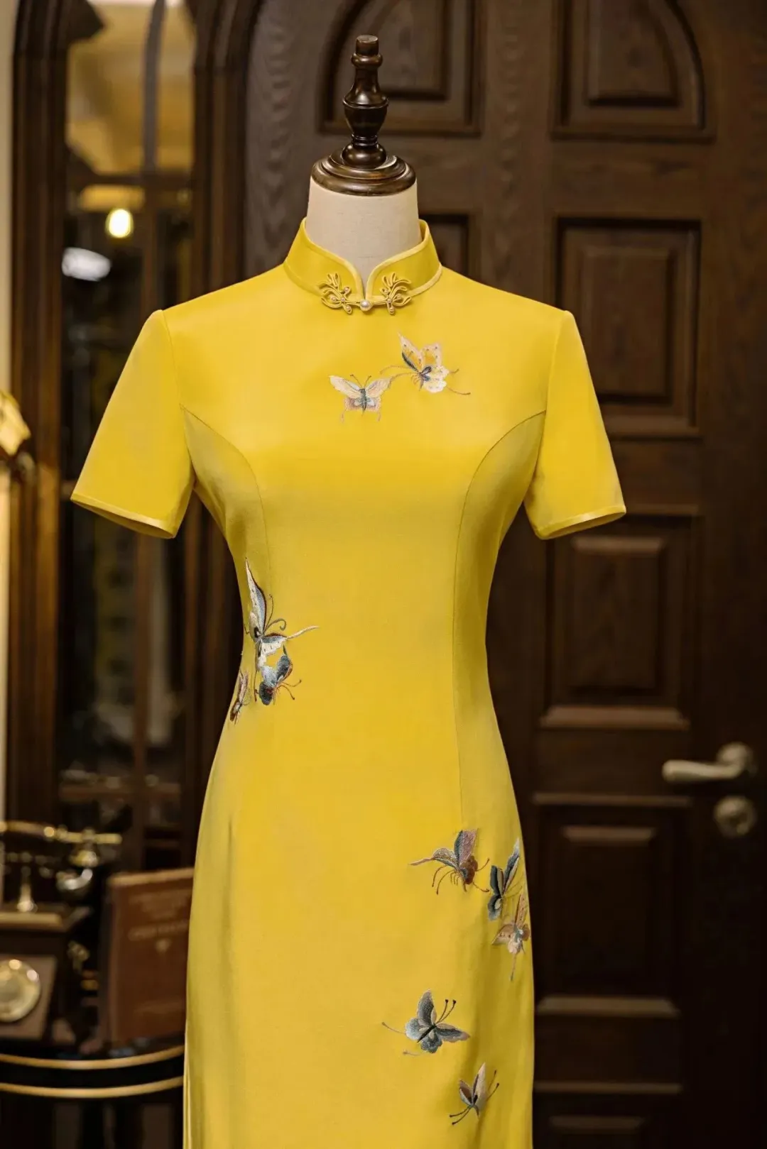 Lemon Candy Yellow: It's a bright and gentle yellow with the freshness of lemon and the thickness of melted sugar. A cheongsam in this color with a long straight skirt and side - slit design shows both the beauty of the color and the sexy charm. The butterfly - flower prints add a lively atmosphere.