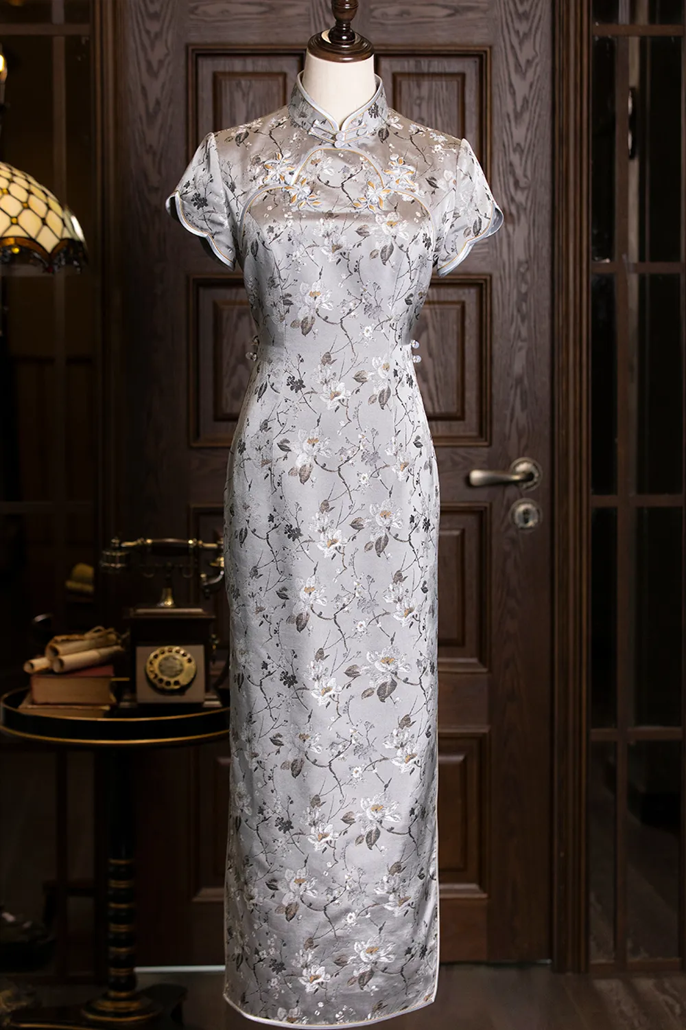 Northern Raindrop Gray: It's a poetic gray, a combination of the cleanness of white, the tranquility of blue and the stability of black. A cheongsam made of Song brocade in this color with white flowers, yellow stamens and dry leaves on the gray background is like a beautiful painting, a classic and elegant work of art.