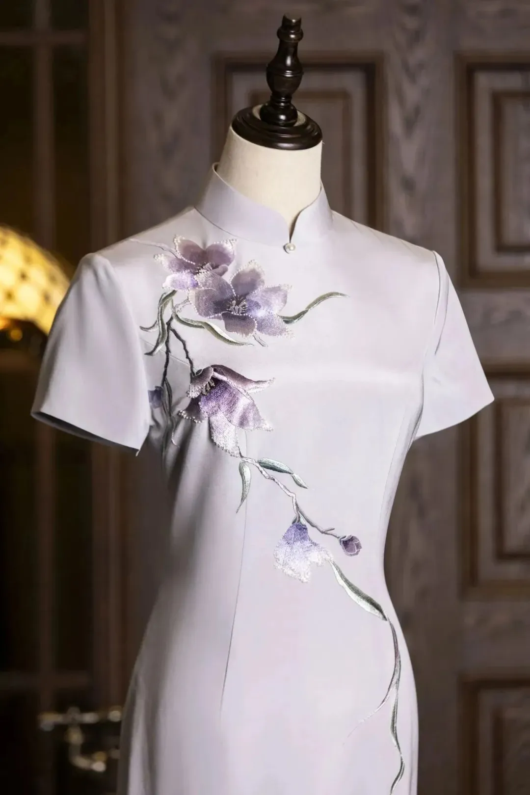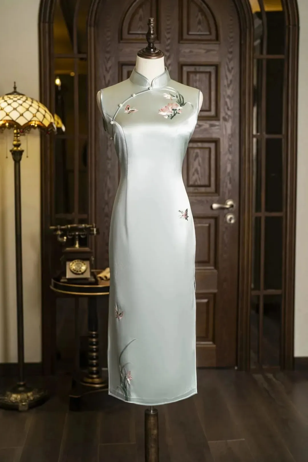 Mint Green: Green is essential in spring and summer, and Mint Green is even more vibrant and mature. However, due to its high saturation, it's better to use it in small amounts first. For example, a cheongsam made of acetate fabric has a light green tone like a summer spring, and Mint Green is used in the embroidery. A silk cheongsam in a slightly darker Mint Green with delicate embroidery shows a rare classical beauty.