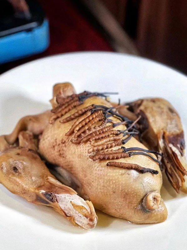 Cordyceps duck (虫草鸭子), a medicinal classic from 19th-century Sichuan, embodies the Chinese belief that food and medicine share the same root. Once served at Chengdu's Tong Ren Tang—a pharmacy that also sold nourishing dishes—it was never just a meal. Cordyceps, a rare fungus that grows from caterpillars, is prized in traditional Chinese medicine for enhancing energy and immunity. The method used to cook this duck—piercing it and inserting the fungus by hand—was both precise and poetic.