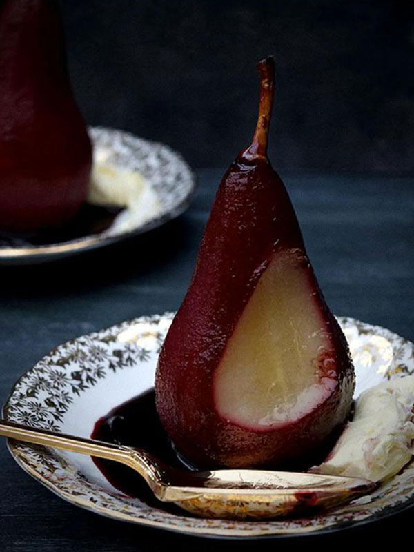 Apples and pears, on the other hand, were best eaten after meals—they were thought to help settle the food. Pears, considered "windy" or gas-inducing, were recommended stewed in red wine with cloves, sugar, cinnamon, and buttered cheese—a combination that sounds suspiciously like poached pears in red wine, a staple of classic French dessert menus.