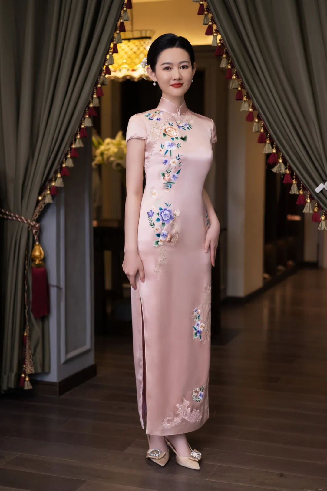 We are always used to choosing red cheongsams for traditional festivals. In fact, pink cheongsams are also a good option. They have the freshness of color and an optimistic atmosphere. Just like this flesh - pink cheongsam, the low - saturation pink is easier to match and is suitable for almost any skin tone. The light - pink visual sense is relatively light. For older women, it's a cheongsam that can make them look younger while maintaining texture and taste, with double advantages and double decoration. The classic design of a waist - cinched and narrow skirt is adopted, making the whole look simple and smooth. The vertical sense of the H - shaped skirt helps to lengthen the lines and make the wearer look taller. In terms of details, the beautiful meaning of blooming flowers is expressed by the clustered embroidery, setting off the pearl buttons on the cross - collar, creating a magnificent sight.