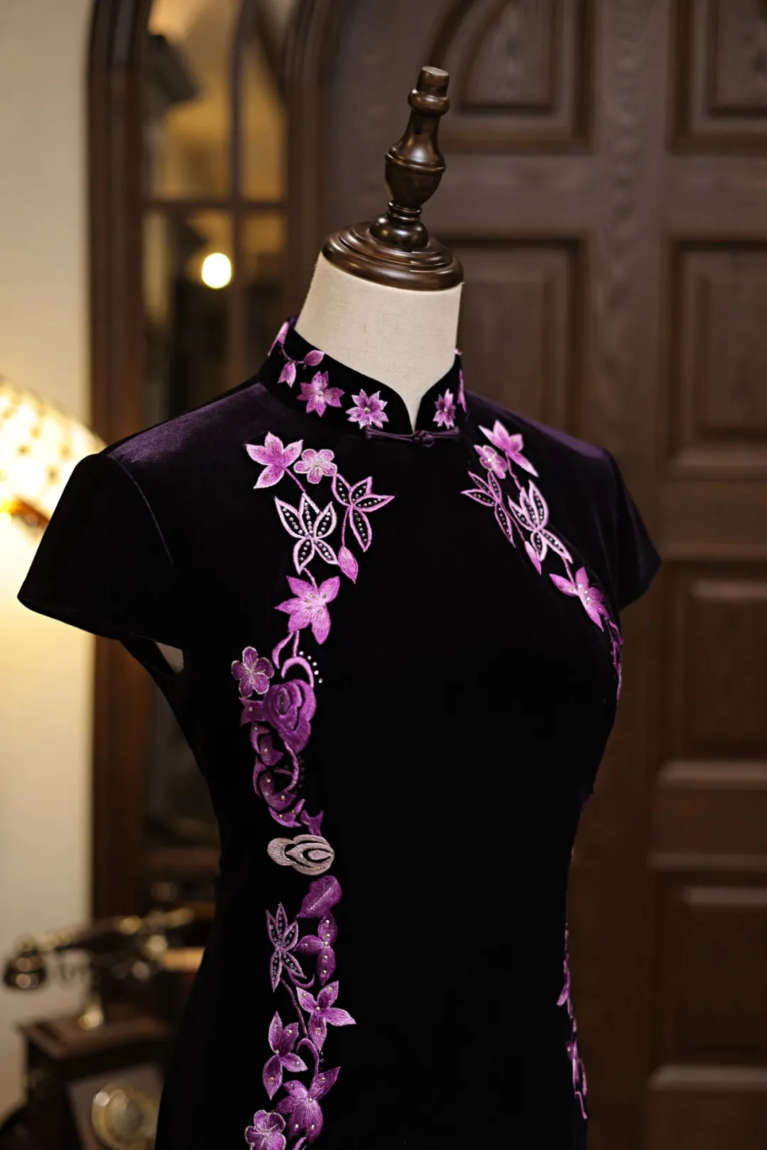 The last one is the star of today, being grand and noble, meeting all the expectations and sense of identity in a festival atmosphere. The velvet cheongsam made of silk material is like the rich purple - red color of a ripe fruit, being cold and charming, fragrant, mysterious, and noble. The style adopts a waist - cinched and wide - skirt form, different from the traditional convergent style of cheongsams. The grand wide skirt determines its aura and can conquer any occasion and festival. In terms of details, the hand - pushed embroidery in the same color system highlights the light and dark changes of purple with blooming flowers in a very hierarchical way. Opposite to each other and extending to the waist - cinching position, it cleverly plays the role of shrinking the waist curve again. Paired with an extra - long skirt, the vertical lengthening effect is the essence of this cheongsam, making anyone who wears it look graceful and tall.