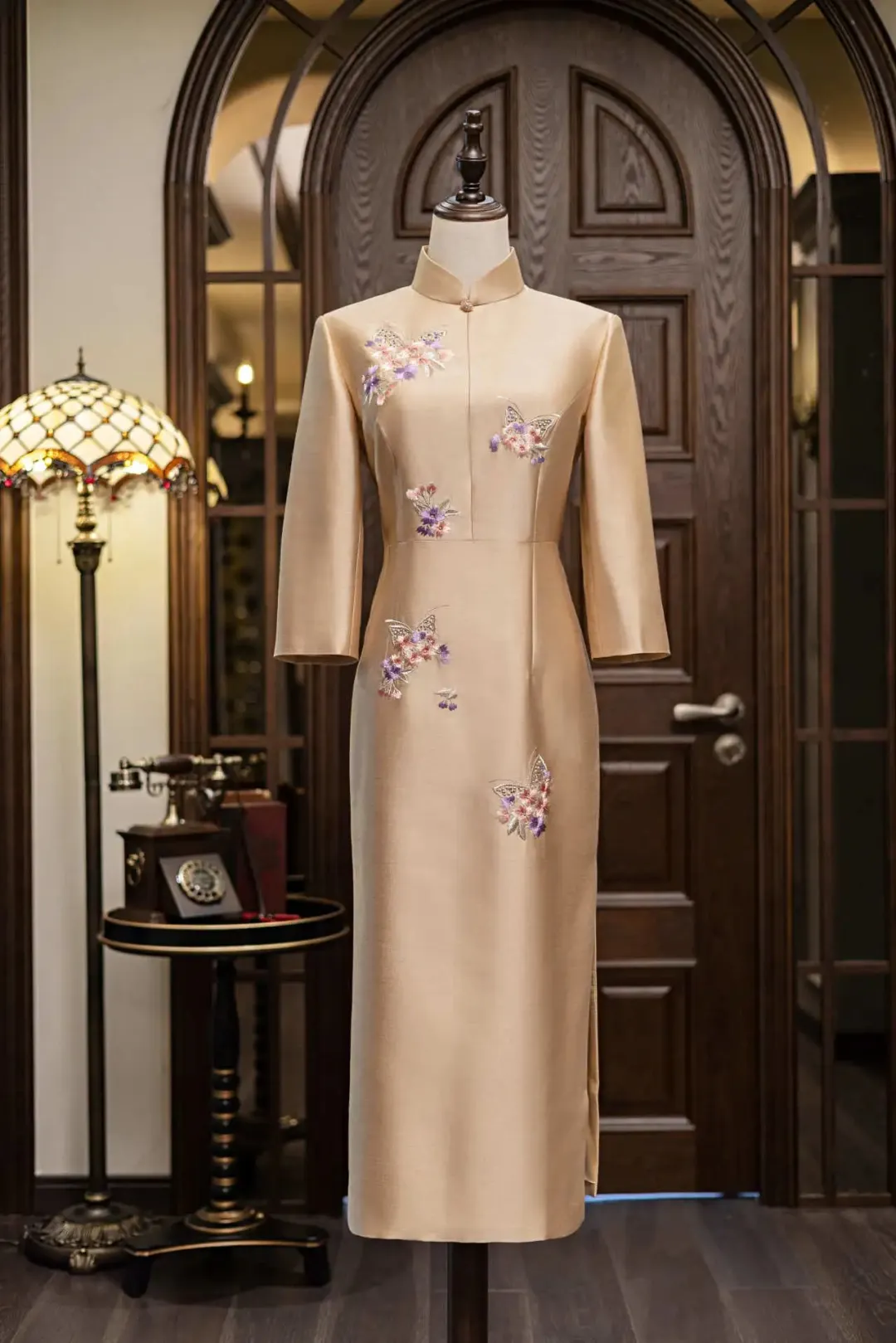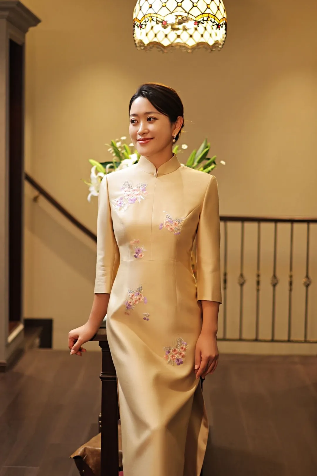 In a festival with such a rich and fulfilling meaning, how can there be no warm - colored cheongsam? It fits the cultural atmosphere of the Double Ninth Festival perfectly. The yellow color of this cheongsam is soft and natural, which meets the color needs of older women very well, showing subtlety and elegance in a low - key way. The silk - wool fabric with a faint luster is not only a symbol of quality but also implies preciousness. It sets off the beautiful artistic conception of flying flowers and dancing butterflies on the fabric, highlighting the exquisite and vivid handicraft. In terms of style, the new combination of a narrow skirt and three - quarter sleeves broadens the seasonal boundary and is just suitable for the temperature and climate in autumn. The details are based on the Shanghai collar and side slits. The collar can enhance the beauty of the long neck, and the ventilation effect of the side slits adds to the overall agility. A small amount of embroidery is just like icing on the cake, being unique and elegant.