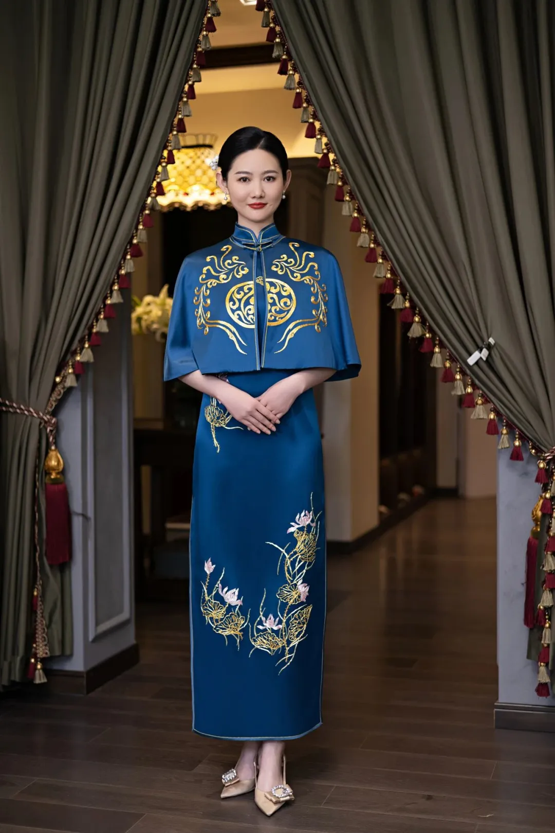 While showing the beautiful and grand style of the cheongsam, it adds an extra layer of elegance. In terms of details, the luster of the satin perfectly matches the dark - blue color. The gold - thread embroidery weaves a vivid beauty of craftsmanship, making the wearer seem to be in an ink - wash painting. It's a cheongsam that is especially suitable for highlighting the taste and vision of the recipient, being solemn and grand and a good choice for any occasion.