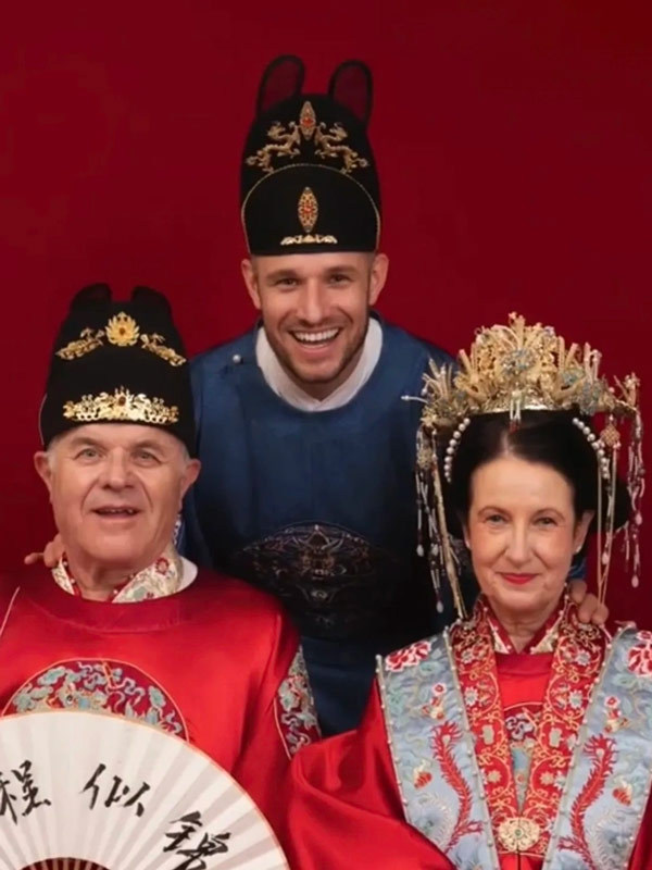 Family bonds strengthen through shared hanfu moments. German vlogger Wu Yuxiang (吴雨翔) gifted his parents Ming-style crimson wedding robes for their 40th anniversary. His mother's trembling hands tracing the phoenix crown's pearls became Weibo's most-shared clip that week.