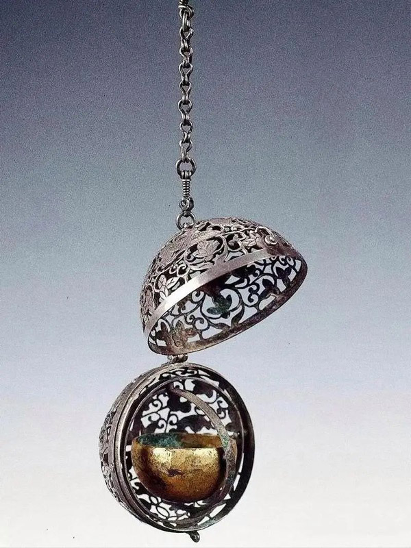 What looks like a simple metal sphere is actually an engineering flex from ancient China. Made of two hollowed-out, perforated metal hemispheres, this little thing houses an internal gyroscope-like structure. No matter how much you roll or shake it, the scented herbs inside won't spill out.