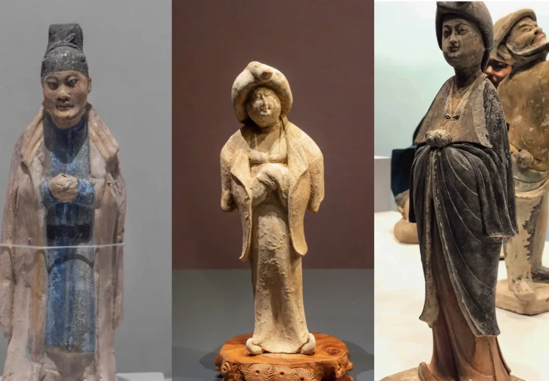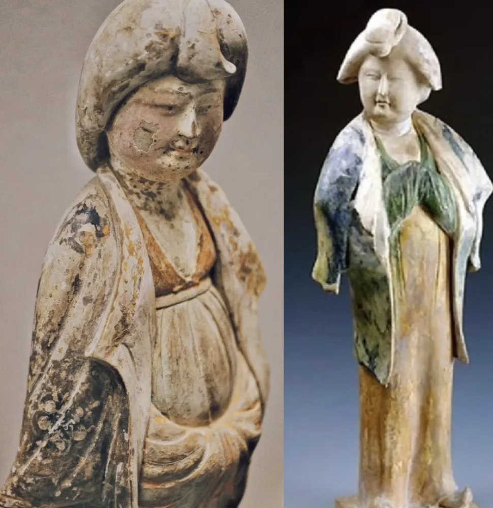 Similar outfits can be seen on Tang dynasty figurines. The round - collared draped jacket generally refers to the round - collared robe and the front - opening robe in terms of its style. When the two sides of the round - collared robe are opened and worn as a draped jacket, it's this style. This draped jacket can be worn open as an outer layer, or buttoned up; it can be worn with the collar turned up or not. The sleeve length is shorter than the outer garment, creating a layered effect. Similar styles are mostly influenced by Hu clothing, which is the result of cultural integration.