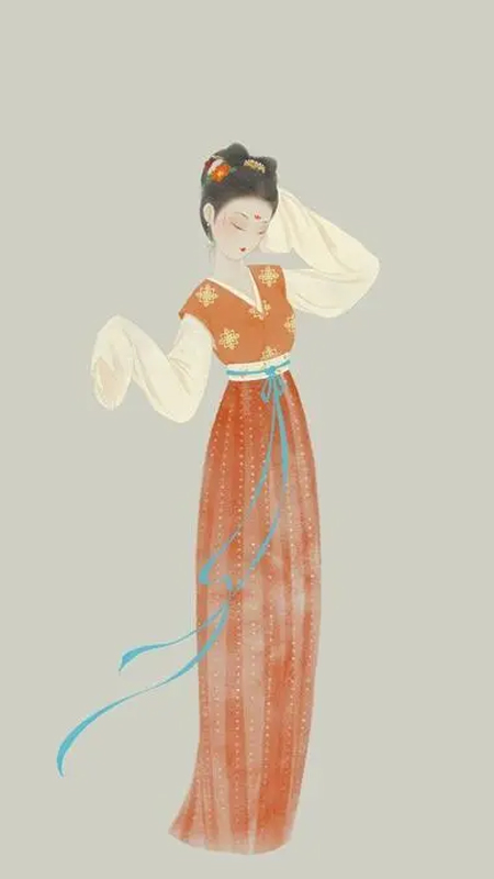 The Tang (618-907 AD) embraced cosmopolitan flair and unabashed opulence. Women's fashion centered on the rúqún (襦裙) combination: a top paired with a long skirt. Early Tang favored sleek, narrow sleeves and fitted skirts (小头鞋履窄衣裳), evolving towards grander volumes later (时世宽妆束). A defining Tang statement was the daring tǎnxiōng zhuāng (袒胸装) – low-cut dresses showcasing confidence. Layering was key, often adding a bànbì (半臂) – a cropped, often sleeveless over-jacket.