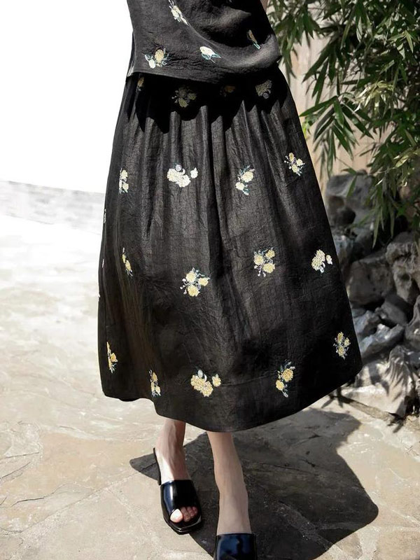 The design draws from classical themes: peonies for prosperity, chrysanthemums for resilience. Yet placement feels fresh—scattered sparsely like constellations. A single branch trails across the skirt’s hem; petite blossoms dot the collar. This restraint amplifies impact.