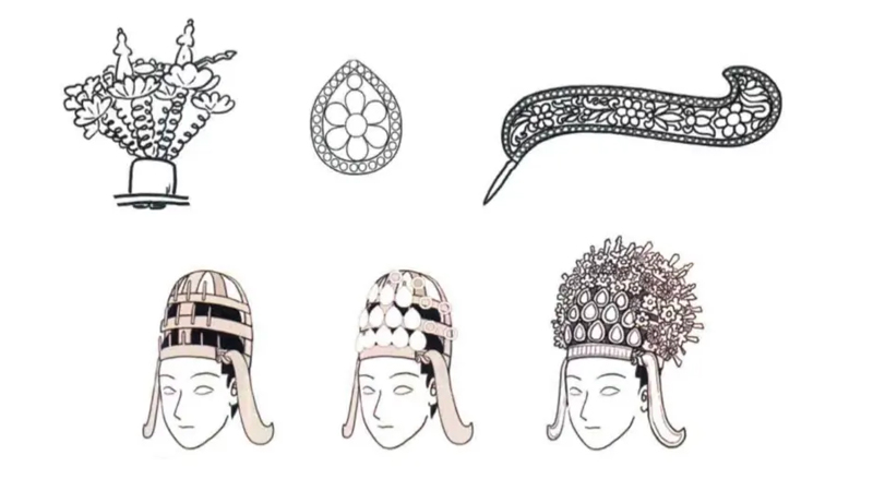 The inspiration stems directly from the exceptionally well-preserved crown excavated in 2013 from the tomb of Empress Xiao, consort of the Sui Dynasty Emperor Yang. This extraordinary artifact comprises thirteen "floral trees" – intricate assemblies featuring wooden bases, bronze stems, and spiraled branches topped with gold-copper floral sockets, glass stamens, and miniature stone figures. Additional elements included twelve teardrop-shaped Baodian (宝钿) ornaments fixed to the front, two S-shaped Bobin (博鬓) panels framing the temples, twelve bronze hairpins, and an underlying metal framework. This specific combination of Huashu (花树), Dian, and Bobin draws upon depictions found in the tomb murals of Prince Li Shou (dated to the Zhenguan era, 5th year), representing the formal attire of high-ranking noblewomen.