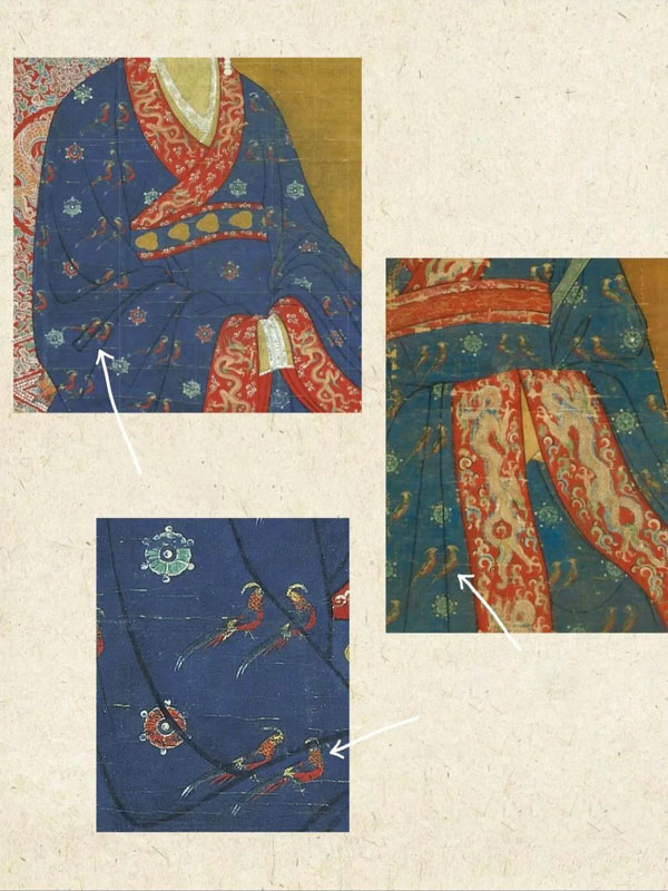 Complementing the imposing crown is Consort Huangfu’s stately robe, clearly inspired by the traditional Zhaiyi (翟衣), the highest formal attire for women in ancient China. The costume manifests a deepqing (a dark blue-green hue associated with nobility) in a classic Shenyi cut – a one-piece garment with a cross-collared, right-over-left closure and expansive sleeves flowing to the ground, projecting solemnity and dignity. The most significant feature, anchoring its identity as a Zhaiyi derivative, is the prominent display of pheasant patterns woven or embroidered onto the fabric. These long-tailed pheasant motifs were the definitive hallmark of the Zhaiyi, strictly regulated across dynasties to signify rank.