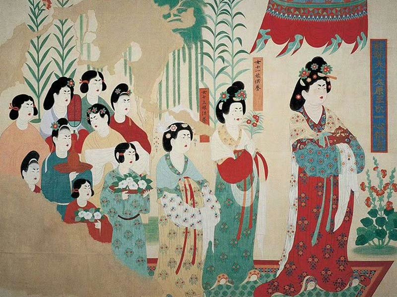 Enhancing the cheeks are Mianye (面靥)– small decorative dots traditionally applied near the dimples. While historical Tang examples found in art sometimes depict whimsical shapes like birds or stars, Flourished Peony opts for a more restrained interpretation, using simple red dots or tiny teardrop shapes reminiscent of those seen on court ladies in Princess Yongtai’s tomb murals. This selective approach demonstrates the makeup team’s strategy: distilling the most recognizable and visually impactful elements of Tang facial adornment.