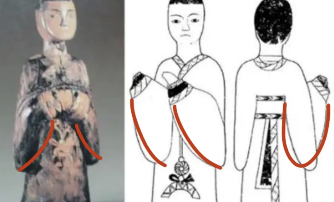 The earliest archaeological evidence for the Chuihu Sleeve comes from the straight - fronted robe unearthed from the Mashan Chu Tomb. According to currently disclosed information, the sleeve styles unearthed from the Mashan Chu Tomb mainly include: narrow sleeves represented by N22; Chuihu Sleeves represented by N15; and wide and straight sleeves represented by N10 (the numbers are the codes of the unearthed clothing artifacts). Among the lacquered wooden figurines unearthed from the Warring States and Han periods, after decomposing and comparing the line - drawings of the sleeve styles, the sleeves are of the Chuihu Sleeve type with a wide and gentle arc, not the Pipa Sleeve type. Moreover, after the clothes were tied with a waistband, the sleeve root was not visible. However, at least wooden figurines are three - dimensional. Some murals are completely two - dimensional and have an added perspective effect, making it difficult to distinguish. For example, some people may think that the sleeve style in the Eastern Han mural is similar to the Pipa Sleeve. Interestingly, only by laying the clothes flat can we know their real pattern. So, from the perspective of archaeological references, the credibility ranking is: physical clothing artifacts > three - dimensional figurines > two - dimensional paintings and murals.