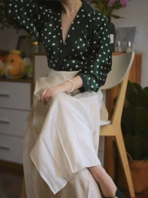 2: Dark Green Polka Dot Narrow Sleeved Shirt + White Twill Couture Half Skirt