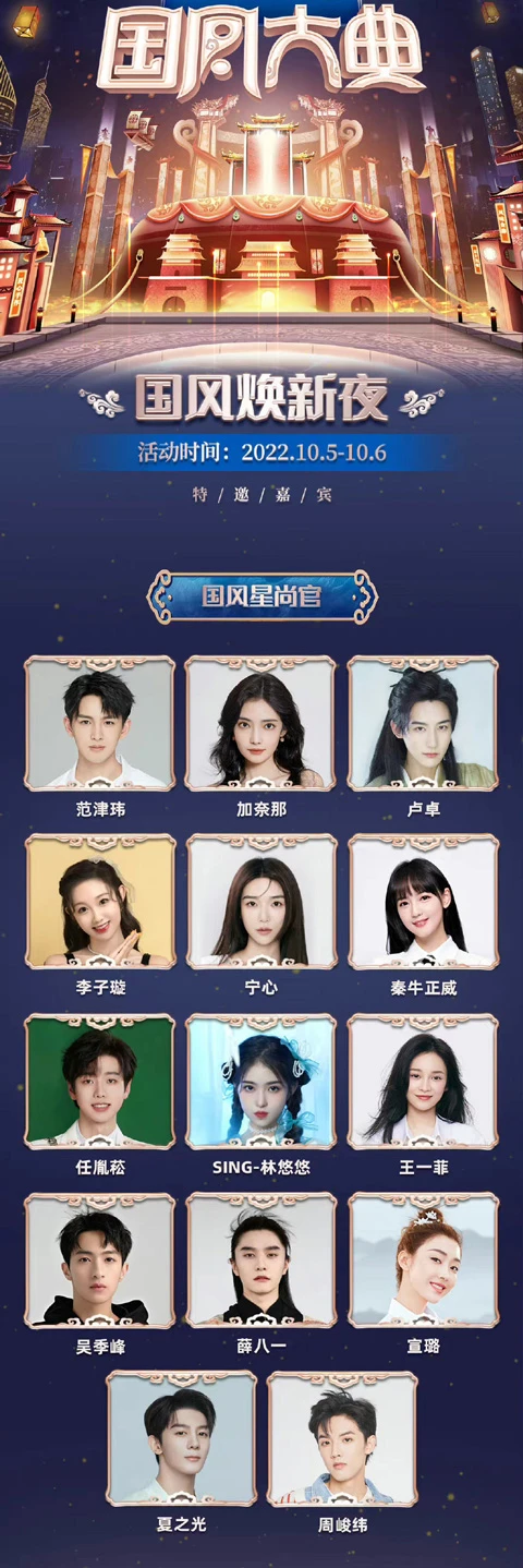 From October 5 to October 6, the 2022 Guo Feng Da Dian (国风大典, Chinoiserie Grand Festival) will be held in Changzhou Oriental Salt Lake City. 20+ celebrities and 150+ Hanfu celebrities will be present.