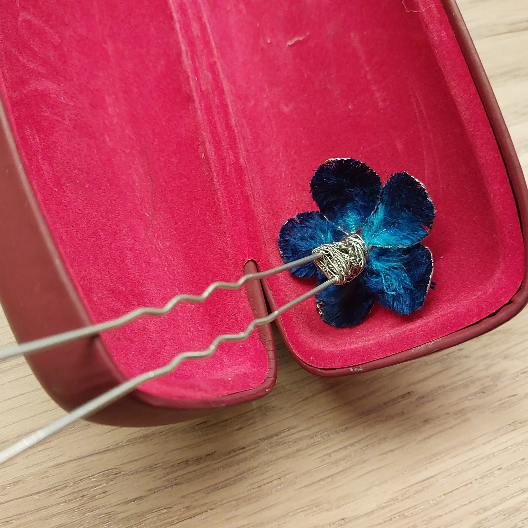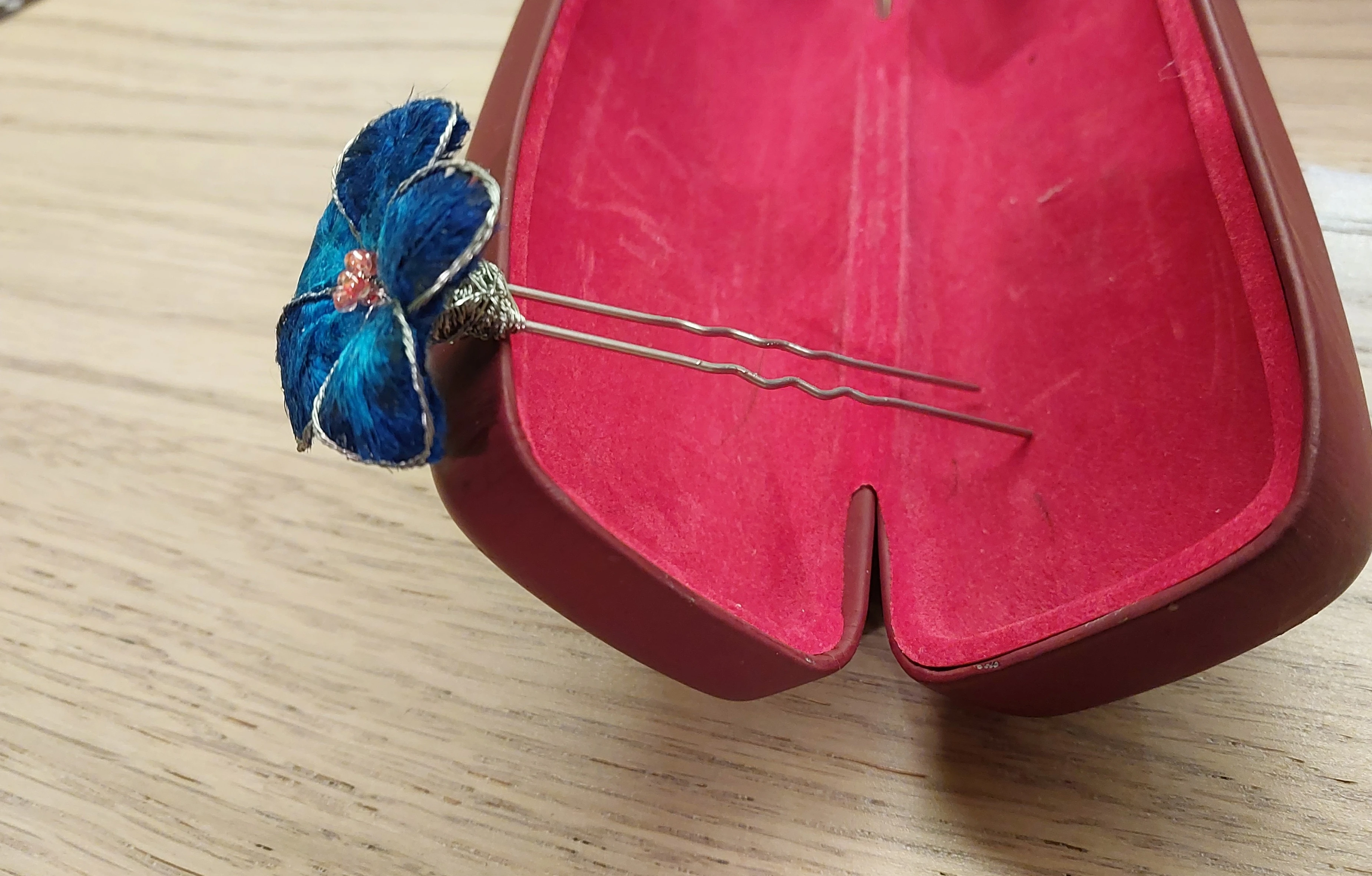 For the first try, I decided to use blue silk, thus decided to create something similar to Tian-tsui. As a result, I've got a small hairpin and that thing for a necklace or a bracelet.